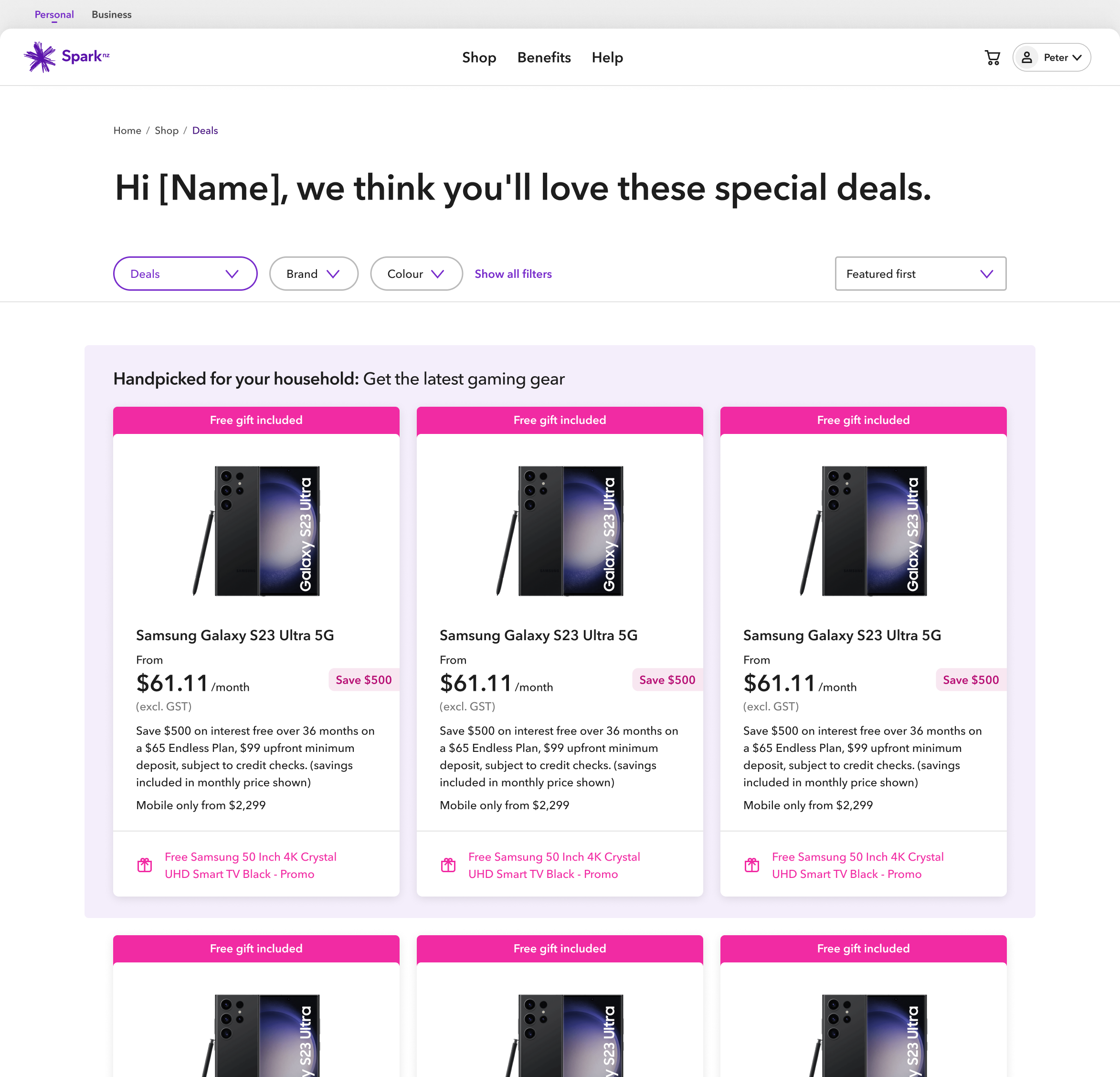 To introduce personalized product recommendations, we utilized the Deals landing page, making minor design changes to incorporate three product recommendations. Customers could access this personalized landing page from three different locations: the Homepage (web), Shop (web), and My Spark RAC (web).
